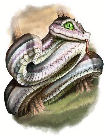 华丽的淡紫色和白色鳞片点缀着这条巨大的蛇,众多锋利的短角从它头上长出。