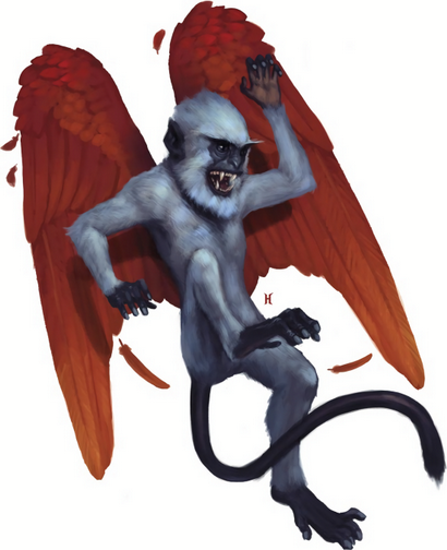 译注:一个具体来历比较复杂的怪物。源自西方翻译中国志怪时产生的疏忽,把"Xiao"用古罗马拼音翻译成了"Hsigo",并且理解成了长着翅膀集群行动的猴子。外网有专门的神话资料网站,上面有关于"Hsigo"的说明和图示,不过维基百科关于"Xiao"字的说明也解释了这个错误。