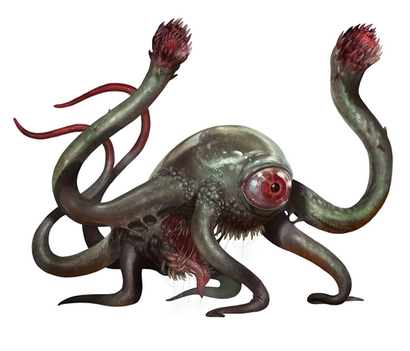 触手眼魔是能体现无底深渊那肮脏的繁殖能力的活生生的证据——那怪异而邪异的恶胎受肉而生之物。通过用它们所携带的深渊的腐败来感染生物,无论它们翻滚着降临到任何地方它们都散播着苦难与不幸——由于它们的位面传送能力,它们准备在整个多元宇宙中散布它们的污秽。一只触手眼魔有 13 尺长,重达 500 磅。