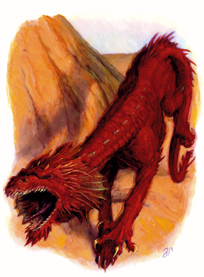 这只四足爬行的生物有着不符于其体型的迅敏行动和如猫般优雅。它暗红色的鳞片上布满了过去争斗留下的疤痕和裂纹,而它晦暗的表情表露出的是怒不可遏。