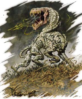 你面前的这只生物看起来就像一只大而无毛的狼。它又白又粘的皮肤上布满了奇怪而抽象的纹身。当它向前移动时,你注意到它根本没有头。在头的位置上,一条长蛇一样的脖子从后背中间长出来。脖子末端是一个大得出奇而被成排牙齿塞满了的胃。虽然没有眼睛,它的嘴准确无误地甩到了面向你的位置,喷出一注酸液。