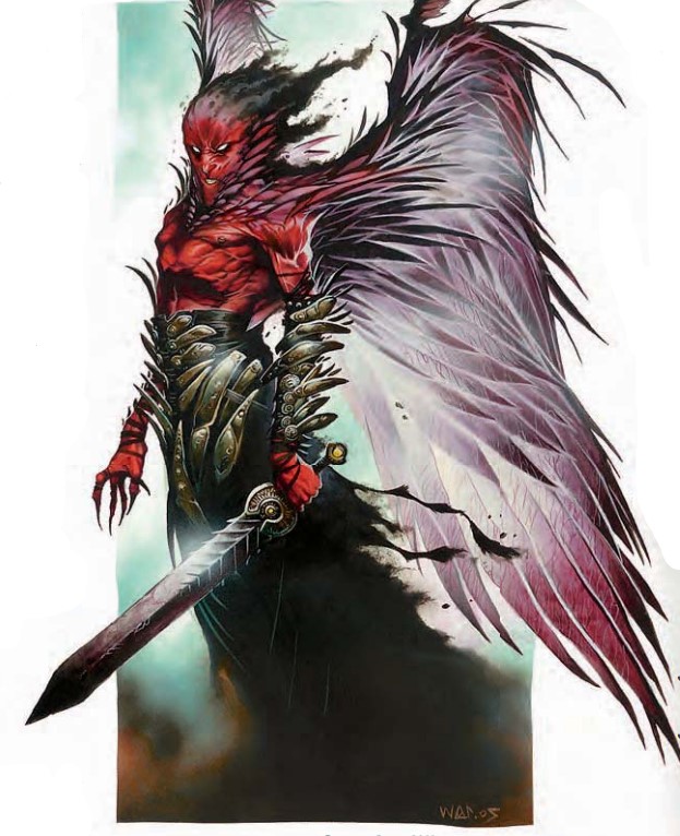 这个生物看上去像是一只长着一对灰暗羽翼的,有着猩红色皮肤的高大魔族。它宽松的长袍装饰着从倒下敌人身上获得的,锃亮的刀剑残片,暗靛青色的云气从它的头顶升起。