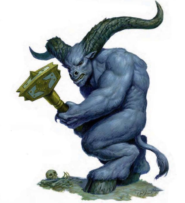 在你面前的是一只有着短灰蓝色毛发的高壮牛头人。它的角从它的头部延伸出接近5尺长的距离,而在它的手中还持握着一把巨大的锤子。