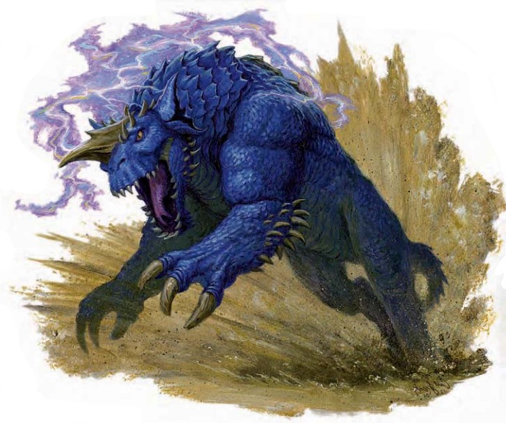 地面在颤抖,一道蓝色身影从地面跃出并洒落一阵泥土与石块的阵雨。这种生物的体型如同巨大的狼獾,但却生有厚厚的鳞片,锋利的独角,和狰狞的蓝龙利齿。突然,在牠的身体上爆裂电流的穿过牠的鳞片产生飞溅的火花和电弧。