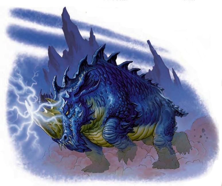 一头笨拙的生物,像马那么大而且有两倍宽,牠那惊人的速度可以轻易的超过你。牠看起来就像是没有翅膀的蓝龙,但牠的体型更加魁梧。牠低下了牠的角似乎在等些什么。突然间你注意到另一头在围着你旋转野兽,也采取了相同的姿势。沿着牠们的角闪电开始爆裂。