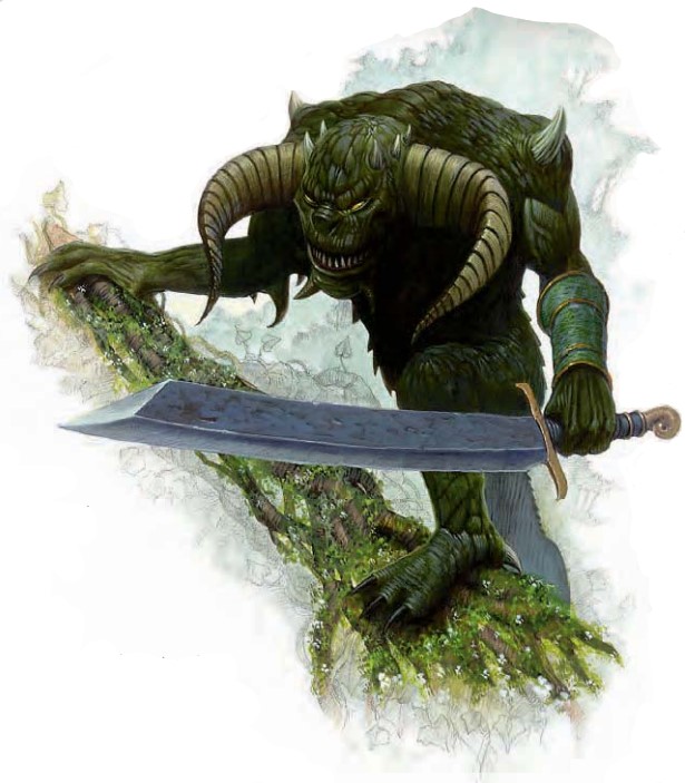 这头类人生物那长满黑色鳞片的皮肤上闪烁着绿色的光芒。两支利角从他的头部向两侧伸出,并沿着他的颅骨向前弯曲。一柄弯刃大刀在他的手中挥舞。