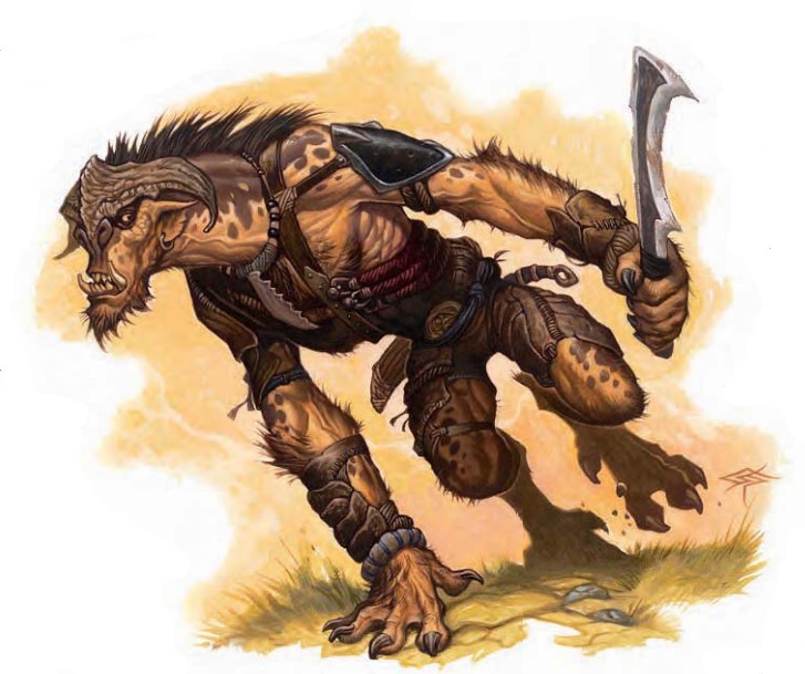 英尺,但却四肢着地奔跑。它有驼背的躯干,狼腿弯曲的般双关节后腿与厚而强壮的皮肤。这个生物与有着毛发的大地精有些相似,但它有着更原始的面容,与从它的头骨处两支一跃而出的弯角。它挥舞着一把利刃般的弯刀。