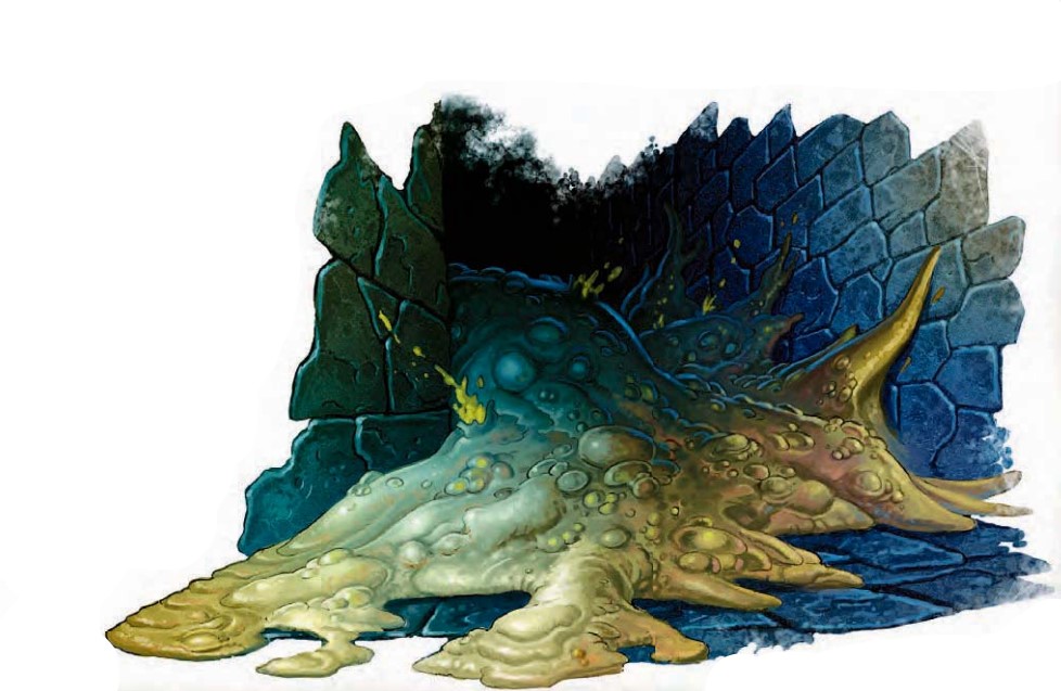 像水面的波动一样,一大滩极其丑陋的血肉从你上方滚落,它团块状的身体上横布满是黄色液体的疣,它发出大声的爆裂声,向空气中喷吐着腐蚀性的液体。