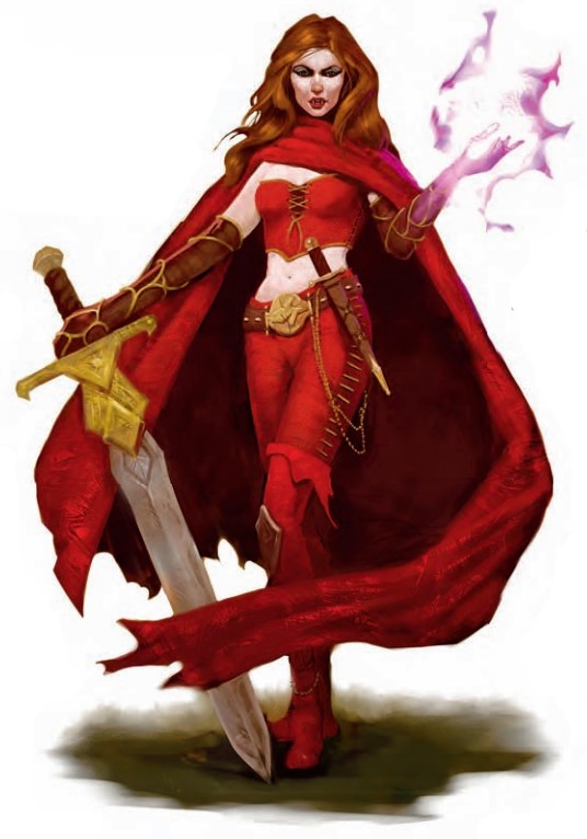 一个惊人美貌的女性悄无声息的出现在你面前,她炽发朱袍,一袭殷红的紧身衣勾勒出完美的身材,一手持魔剑,另一手挟幽然冥火向你挥来。