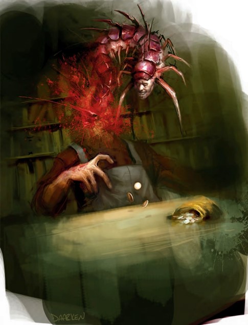 那个商店店主向你转过头来,脸上带着愚蠢的笑容。“这是你的找零,这是你的找零!”他的音调上升,最后到了尖叫的地步。之后,鲜血喷了出来,他的脸从他的头骨上分离,向你飞跃而来,脸后面还带着一条一尺多长的蜈蚣状尾部。“这是......你的......找零!”在拦到你的道路上的同时,这条有着店主面部的蜈蚣依旧这么尖叫着。
