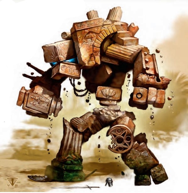 倒下墙壁的碎片和破碎的建筑物歪向出现生物的一只脚。完全由碎石组成,巨大的驼背两足生物出现在你面前,向你举起了它的石拳。