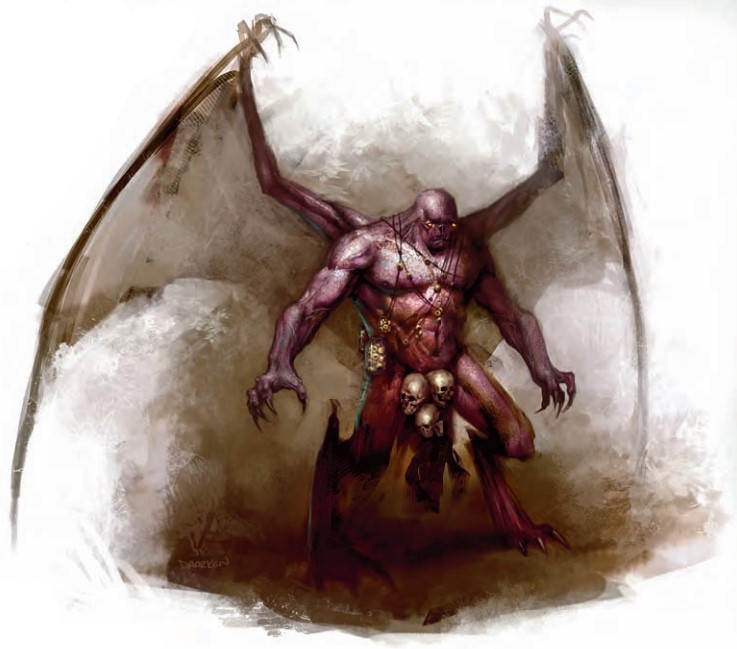 这个看上去像是一个长着蝠翼的儿童一样的紫色皮肤的生物从天上飞落下来,它黑色的爪子抓向了你的双眼。明显是眼珠做成的项链在它的脖子上晃动。