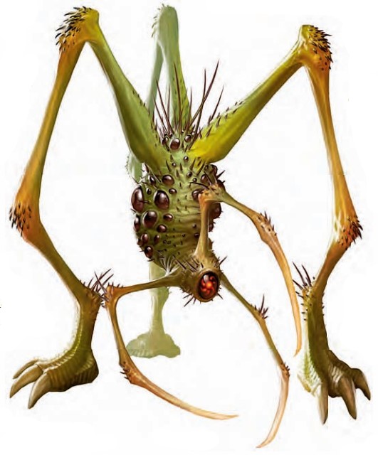 一个没有毛发的有着人类大小的生物靠着从它的顶部伸出的三只肌肉发达的腿部潜行着。肿胀的液囊凸出了它的体表。一只红色的独眼在大量可能是该生物的脑袋的褶皱的肉块中向外窥探着,但这些大团的褶皱位于这个生物的底部。在它的眼睛周围伸出了三只手臂,每支末端都是骨钩。