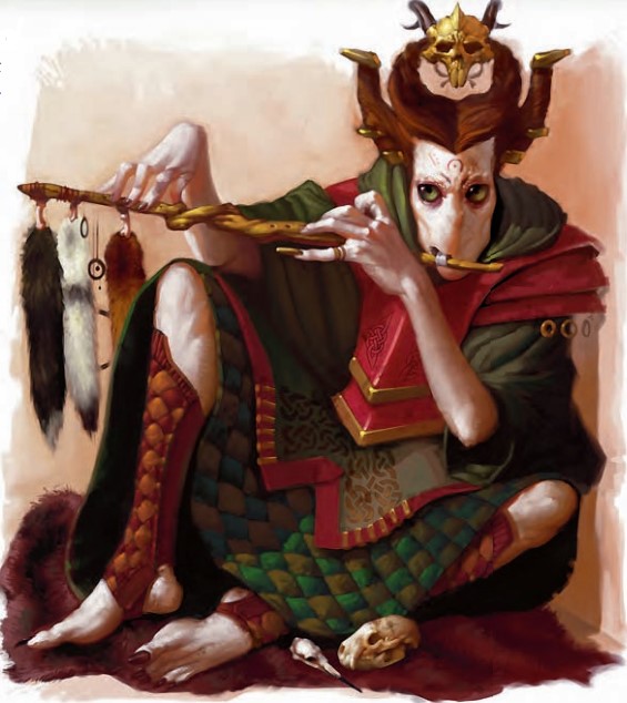 报丧女妖是一个身着深绿色盛装的苗条人形,头戴饰有坠落至双肩的金色饰物的华贵头饰。要不是那对金色的昆虫一般的眼睛,这个生物椭圆形的面部令人恐怖地毫无特征,它正将一支木雕长笛举至下巴开始演奏一曲令人难忘的旋律。