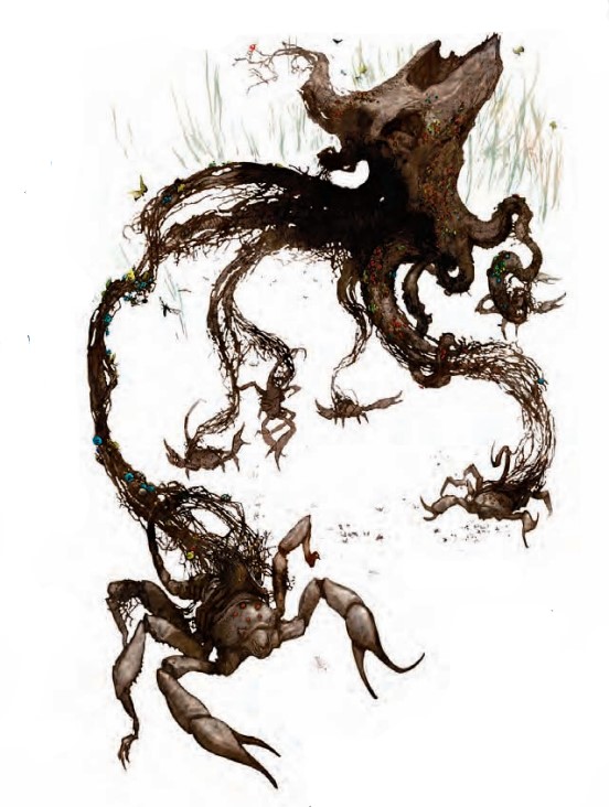 这团树枝和根须纠缠在一起,周围环绕着一群昆虫。从它的核心突露出六条手臂,每条手臂上都抓着一只4尺长的构装体蝎子。