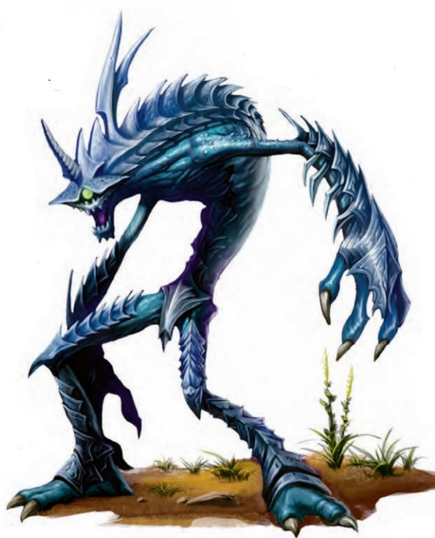 这个轻盈有角的生物有着蓝灰色光滑金属构成的身躯,整个形状类似人形。它的关节处闪耀着锯齿状的刀刃,重叠的金属甲片遮掩住了一柄随时等待出击的细长武器。