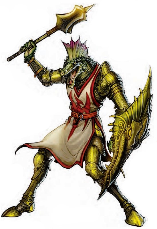 在这个生物头盔下的那对龙类的黄色眼睛闪闪发光,在在他那皮甲之间露出了闪亮的鳞片。手里拿着一柄沉重的权杖,他提着一面装饰有提亚玛特盾牌并大声呼喝着。