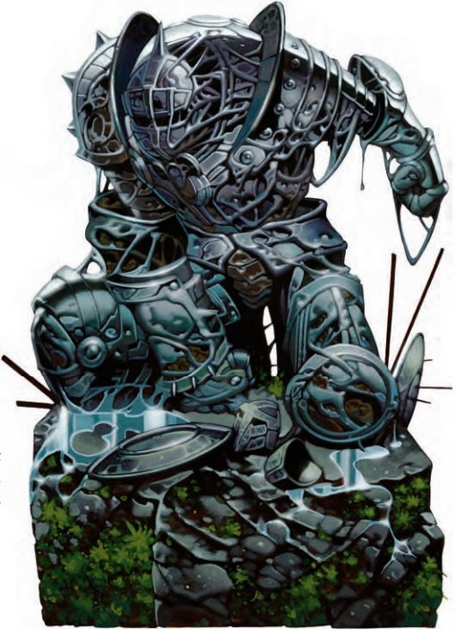 力能魔像有着人类的外形,但其身体表面覆盖着反光的蓝绿色钢板。这个生物看起来已经错位,就像被强有力的手碾压过一样。它的身体下陷,就像身上的装甲已经融化,或者被强大的力量改造成新的形状。