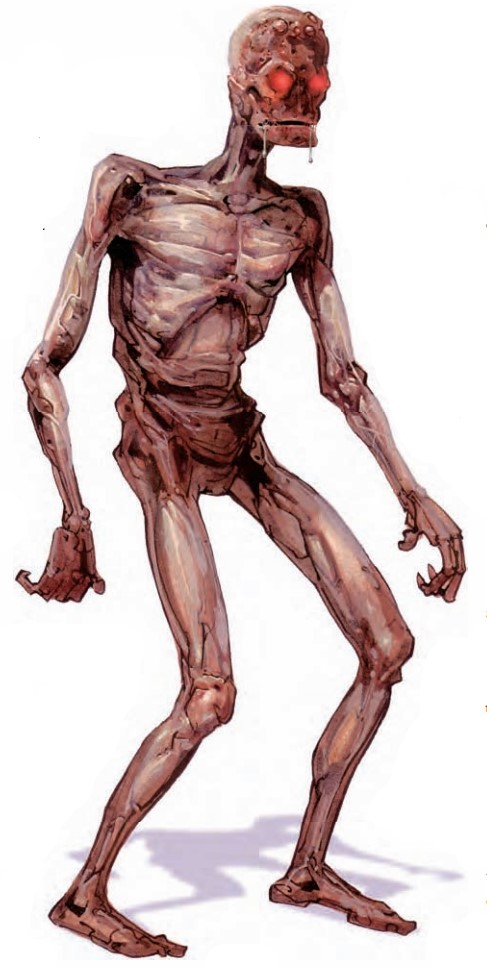 这个秃头,多瘤的生物,看起来好似一只覆盖着红色褶皱皮肤的高耸骷髅。一道渗出液体的伤痕充当了它的嘴巴,两点深红色的光芒在它的眼中闪烁。