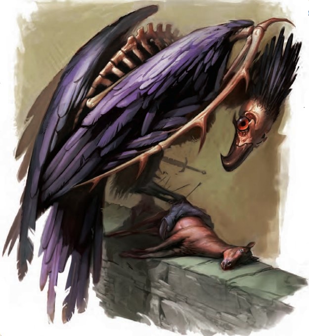 这骨瘦如柴的大鸟邋遢不堪,乌黑的翅膀上布着锋利的骨刺。血红的双眼看起来充满恶意,并闪耀着邪恶的智慧。爪子和弯曲的喙是他的致命武器。