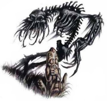 可怕的形体从黑暗中涌现。它的一半是骨头一半是有如实质的浓重黑暗。总体上它看上去像是无脸无翼的恶魔,狭长的骨爪上面覆盖着墨色黑影。