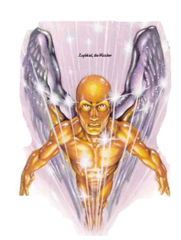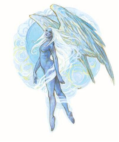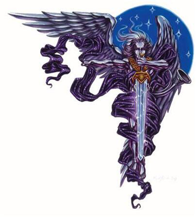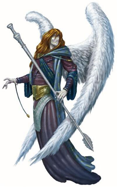 这个高大的身影看起来是个9英尺高,拥有银色皮肤和暗紫色眼眸,看不出性别的人类。巨大的覆盖着白色羽毛的双翅使他的双肩更为优雅。他穿着一件缀有如星辰般闪烁的光尘的紫罗兰色平滑长袍。他挥舞一把爆裂着电光的长剑,携带着一把光亮的银色号角。