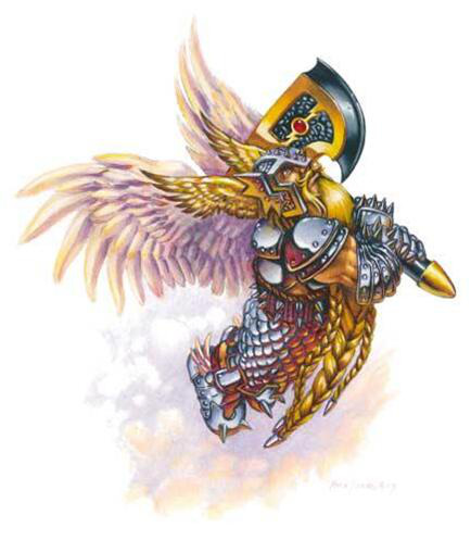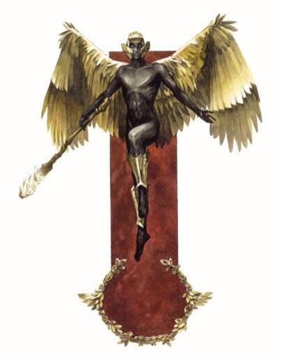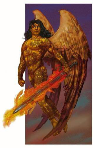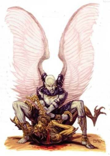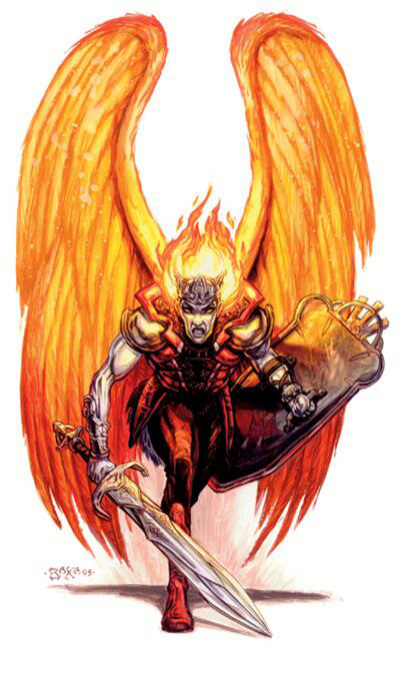 “一团闪耀着的金色能量旋涡在你面前慢慢浮现,仅仅是感受到他的存在,就能充分感受到那绝不可能存在于凡间的正义与公正的气息。突然,这团能量凝聚成实体,一个无比英俊健美,没有性别特征的高大形体出现在你面前。那是一个10英尺高的亚空神族,拥有纯金色的皮肤,以及辉煌壮丽,闪耀着白金色金属光泽的白色羽翼。他身周环绕着炽热的光芒,但他的表情却谦和与亲切,令人宽慰。”