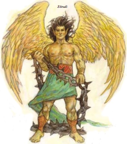 “那个生物……你能相信那个有11英尺高,浑身肌肉虬结比史泰龙还夸张的超级猛男居然是个精灵吗?他有着闪亮的青铜色皮肤和充满野性的黑发,昭示着其精灵身份的尖耸长耳如同刀剑一般锐利。这粗犷生物拥有如雕像般完美的肌肉和闪耀着青铜色光泽的双翼。而在他的手中,更拿着一把巨大的刺链。”
