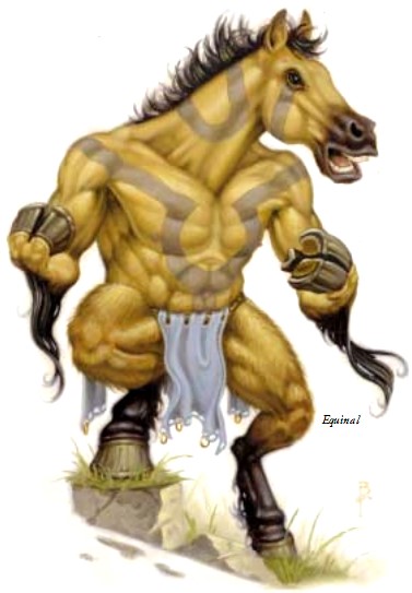 这种生物长得像是具有某些驮马特征的人类。其胸膛与肩膀宽阔得极为夸张,长长的手臂上长着粗大铁硬的手指,弯曲成挙时相当于巨型铁蹄。它的腿则更像修长的马腿,脚则是真正的蹄子。下肢覆盖着浓密的短发,马脸狭长,一纵长长的鬃毛从其头顶一直披垂下来,一直长到其后背中央。
