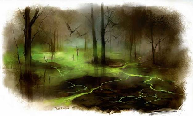 油腻污浊的暴雨永恒不变地倾泻在弥瑙洛斯的土地之上,最终在漆黑的土地上形成一片片淤泥滩,沼泽,泥潭,以及污水坑,不洁的污水散发出种种令人作呕的恶臭,让人很难分清很哪种气味更加污秽肮脏。颜色各异,阴沉而压抑的云层密麻麻地遮蔽着天空,从灰蓝色一直到腐败的靛青色。