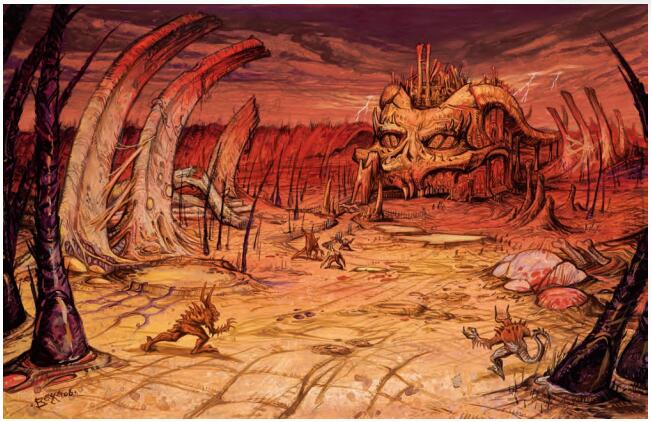 悬在马勃尔热的大部分是一系列石质的半拱,每边八面。这些奇怪的结构仍然被认为是扭曲的,被石化了的马拉加德的肋骨。从毛茸茸的苔藓到光滑的灰色藤蔓,奇怪的生长物覆盖着它们,这是一种不断变化的令人恶心的繁殖方式。像河马一样大的肿大的肿块,在足弓的底部发育,偶尔会掉落下来,压碎下面的小恶魔,有时过量的增长会出现夜鬼婆,地狱虱子,或paeliyron但大多数这种粘性物质都包含剧毒(接触、强韧DC 25、2d4 Con/2d4 Con)。