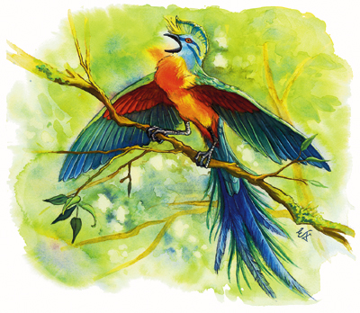 这只色彩艳丽的鸣禽约有两尺长,翼展约有3.5尺。凭借它们动听的鸣叫,乐土画眉为了祝福地域之极乐境中充满乐趣和满足的氛围而贡献着自己的一份力量。