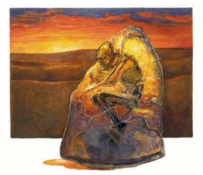 在沙漠上伫立着一块冰。在里面是一个像球一样蜷曲的类人生物形体。这个类人生物就几乎和冰一样光滑和透明,但是它的眼睛是打开的,它们就像山脉冰川一样湛蓝与寒冷。