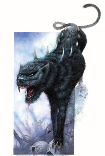 这只巨大的夜狮像夜一般漆黑,有着鲜黄色的双目和特大号的利齿。尖利的脊刺从拱形的背部突出。