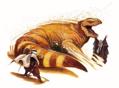 这种酷似某些恐龙的巨型条纹蜥出没于荒漠和灌木林地中,四处搜寻着猎物。事实上它会大胆的攻击任何经过它面前的生物。