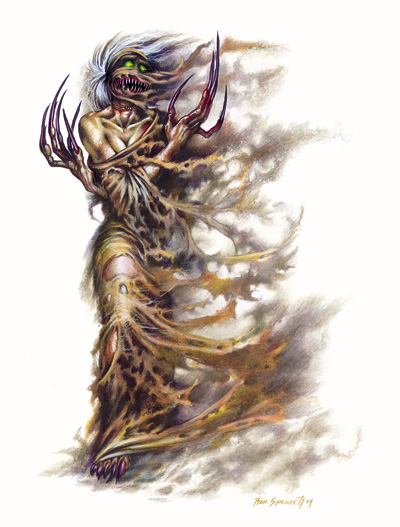 伴随着褴褛的,干枯的,疯狂兴奋的哭泣,这个类人生物有着似乎发出绿色微光的眼睛。它的笑嘴中夹杂着巨大而尖锐的磨损骨牙,而它的手则是沉重的、发黄的、肮脏的爪子。