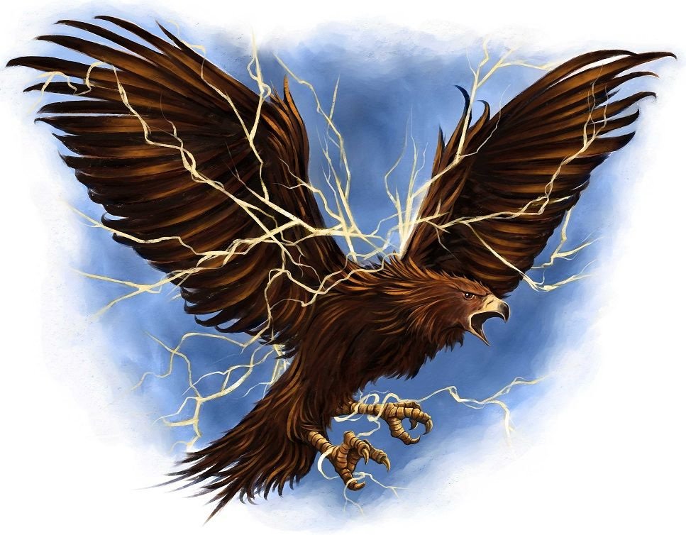 战斗:饥饿的雷鸟是可怕的对手。它在战场上空盘旋,当它翅膀向地面上煽起暴风时它用它的爪子和鸟嘴发动攻击。通过睁开布满电光的双目,它就可以在晴空下召落闪电并用密集的雷电轰击敌人。