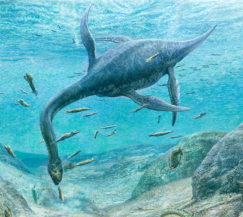 这个光滑的爬行动物优雅的乌龟一样的躯体上长着细长的桨状蹼。它蜿蜒的脖子顶端是长着极其锋利的牙齿的蛇一样的头颅。