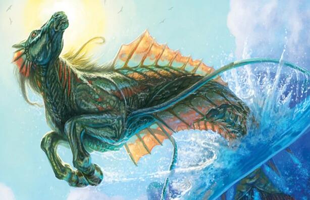 这只野兽看起来像是马和鱼的混血。它用鳍代替了蹄子和马鬃,它的像马一样的身躯在后部缩减为一条布满鳞片的鱼尾。