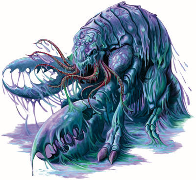一个酷似大型甲虫或是变异的甲壳动物的邪恶生物从黑暗中爬出,它钳形的爪子疯狂的猛烈张合。厚厚的黏液套在它透明的甲壳上并从它那一打或更多的嘴中伸出的触手上滴落。当它像你爬来时,身后留下了黏液的尾迹。