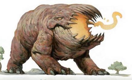 一头庞大的四足生物笼罩了附近所有的东西,它覆盖着板甲的身体上映出周围的光线。这生物放低身体靠近地面,它短而有力的腿从体侧伸出,使它牢牢地立在适当的位置上。这生物的身体直接连接着它的头部,一张看上去很危险的大嘴向外张开,露出了林立的牙齿。