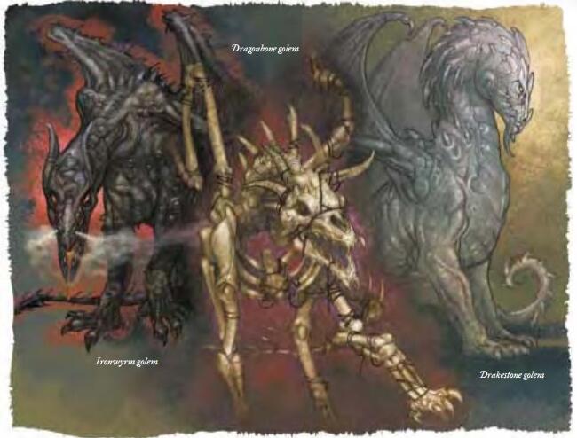 一般来说,魔像的活力是来自土元素位面的精魂。然而,这里提供的三种魔像-龙骨魔像、龙石魔像和铁龙魔像-改为灌注以强大的龙的生命力。制造过程将不情愿的精魂束缚到人造的身体,并让它屈服于魔像的制造者的意愿。