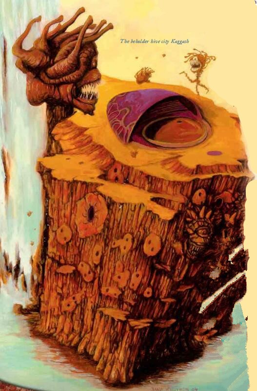 在主物质界一个未知世界的偏远地区,坐落着巨大的眼魔巢城卡伽什(Kaggash)。这座位于雾岛火山的地表城市规模空前庞大,眼魔人口约有两千。传闻中,十只乃至更多的巢母之眼联合统治着卡伽什。