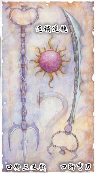 连锁透镜(Lens of Ray Chaining):这块小透镜可以套在眼魔的眼梗上,并吸附于眼睑的适当位置。由装备了此透镜的眼梗发出的射线会被增强,从首要目标连锁跳跃到射程范围内的另一个目标身上。若射线未能命中首要目标,也不会转跳到新目标上。施法者只要手持此透镜,就可以如同额外的器材成分一样使用它,连锁一个射线类法术。全新的连锁透镜在使用过9次后就会破碎瓦解。