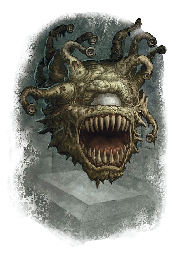 眼球射线 Eye Rays(超自然):亡眼暴君生前有10只小眼,位于躯体上的眼梗末端,每只都有超自然能力,还有一只巨大的中央主眼。亡眼暴君在死亡时会随机失去1d4+1只眼睛。