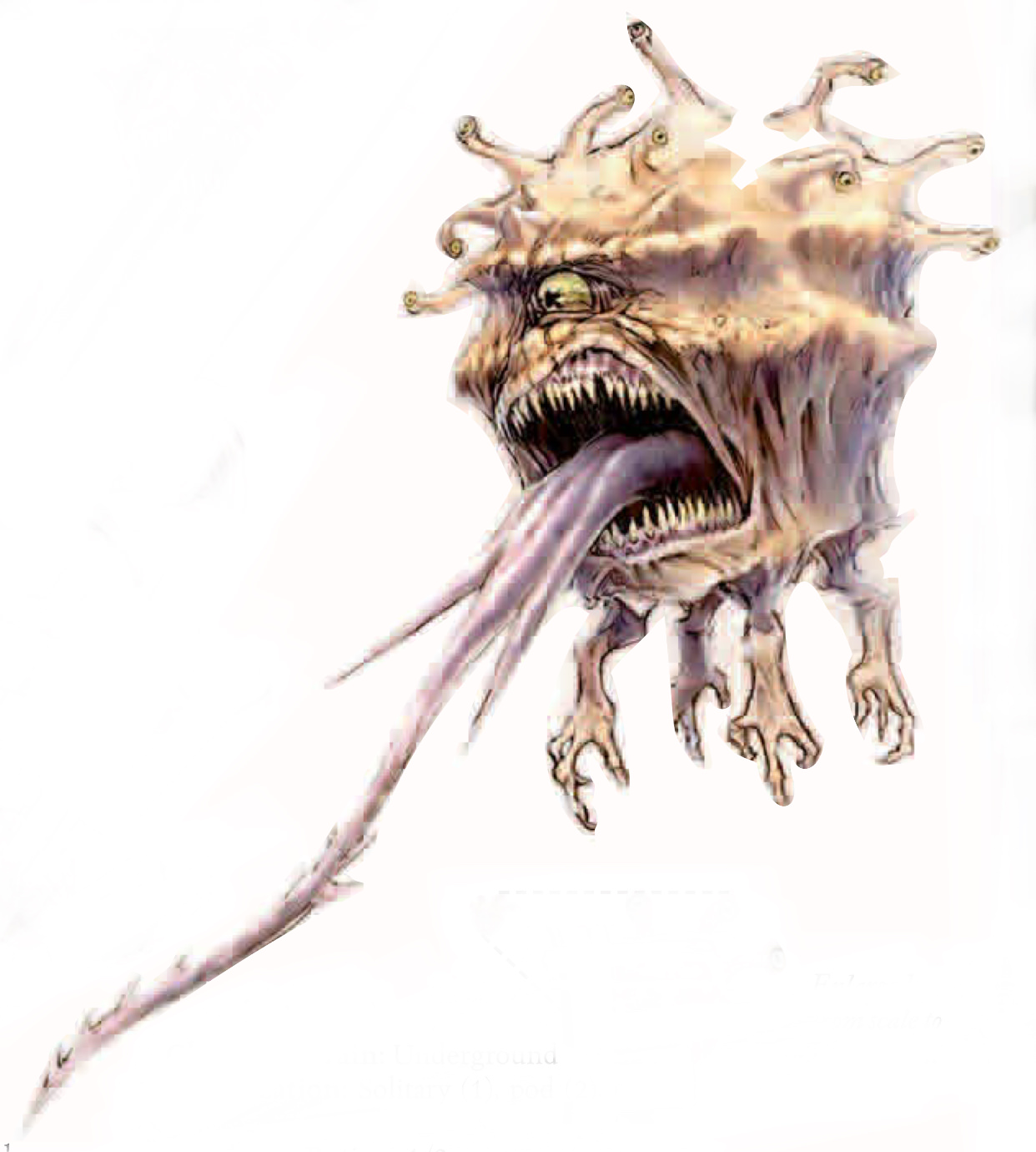 凿舌之眼与真眼魔的差别可以通过它们臃肿的体型(10英尺宽,真眼魔只有7英尺)、癫狂的外观(10条痉挛颤搐但毫无魔法能力的眼梗)、尖声嘶叫、四条小腿(挂在球形躯体下面)和可怕的舌头(戳击猎物时可以伸出体外长达15英尺)区分出来。