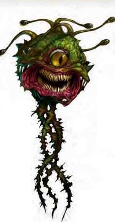这个膨胀的绿色肉球被上百块联锁骨板组成的外壳所包裹。肉球上面是六条翻腾摇摆的眼梗,下面拖着三条尖刺丛生的触须。球体正面是一只大眼睛,位于布满刺针般利齿的嘴部上方。