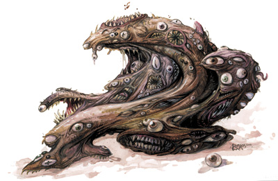 这个不健康的生物的身体有一个变形虫的形状和流动性。它的表面有人肉的颜色,但没有一致性。无数的眼睛和牙齿的嘴不断形成,当他们变得明显时又隐藏进身体里消失不见。