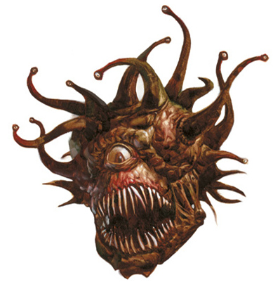 它在你面前飘浮着,球根状的身体上有一只位于中央一眨不眨的眼睛,一张尖牙利齿的血盆大口。从球形的身体上十条蜿蜒扭曲的肉茎眼梗,每一条的末端都是一只较小的眼睛。