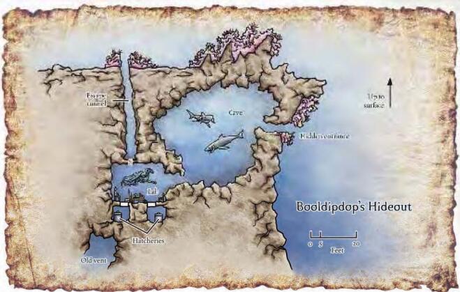 由于珊瑚的茂盛生长,洞穴的入口难以注意到(侦察DC25)。血腥艾普到来时,这处礁石已经存在,但他从附近的地区移植来更多的珊瑚。现在,对于大于小型的生物来说(包括血腥艾普自己),该入口是极度拥挤的。